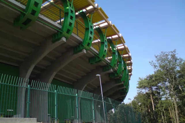 Realizacja dotyczyła modernizacji trybuny stadionu żużlowego w Zielonej Górze przy ulicy Wrocławskiej 69. W ramach projektu dokonano wymiany konstrukcji żelbetowej, a także zainstalowano nowy dach. Dzięki przeprowadzonym modyfikacjom na nowej trybunie może zasiąść ponad 6 000 kibiców w 25 rzędach.